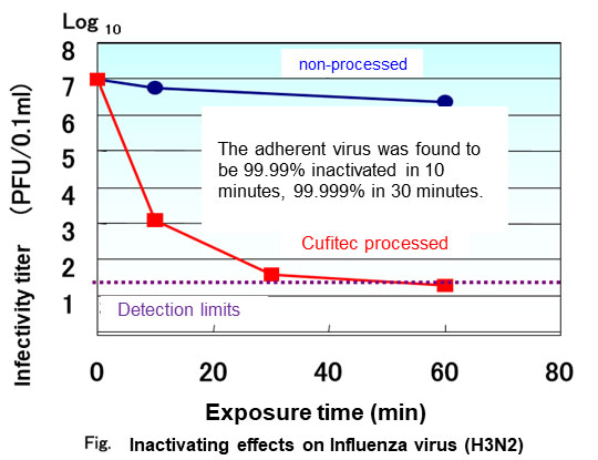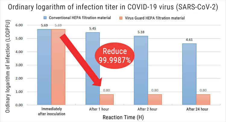 日本纺织产品质量和技术中心 (QTEC) 进行了 Virus Guard 针对 COVID-19 病毒 (SARS-CoV-2) 的抗病毒性能测试。并且已经证实,它仅在一小时内就可有效减少 99.9987% 的 COVID-19 病毒(SARS-CoV-2)。