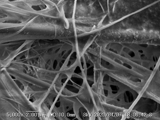 无机纳米粒子的大小约为50nm,在加工成过滤材料时被包覆在整根纤维上而不会堵塞。