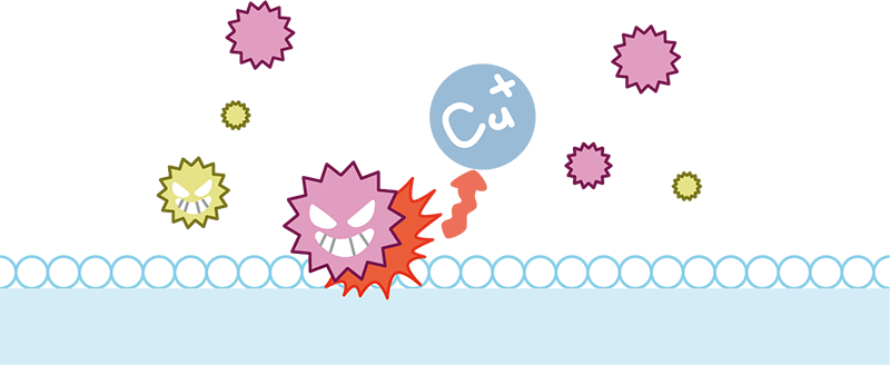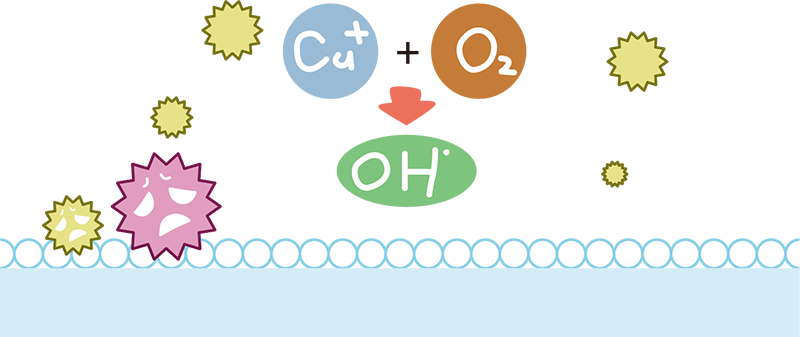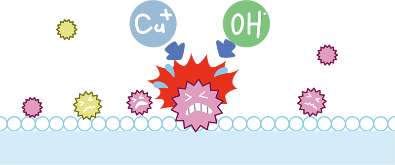 当一价铜化合物纳米粒子与病毒或细菌接触时,一价铜离子会在水分中洗脱。