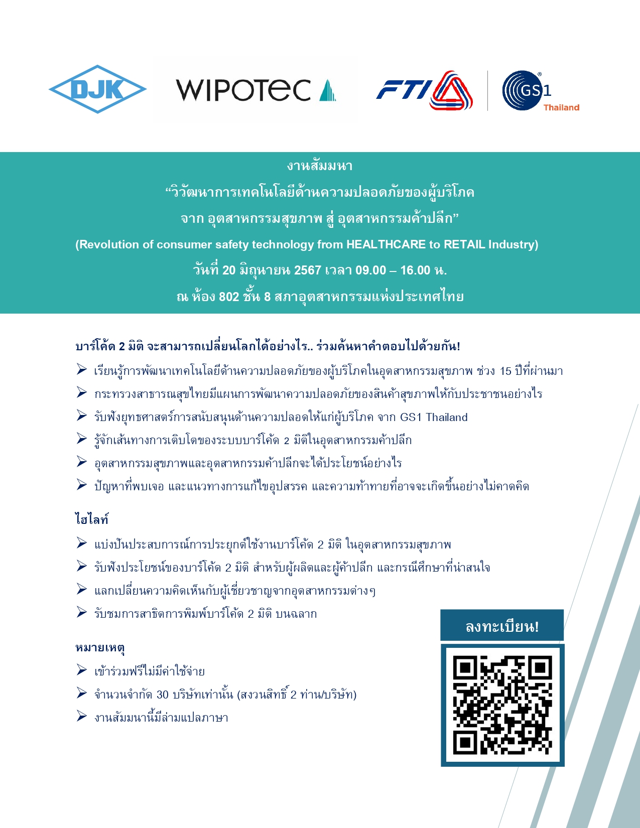 Together with GS1 Thailand and WIPOTEC, who is a world leading manufacturer of Serialization/ Track & Trace system, we will introduce Thai customers how 2D code can change the world in terms of Customer Safety Technologies.